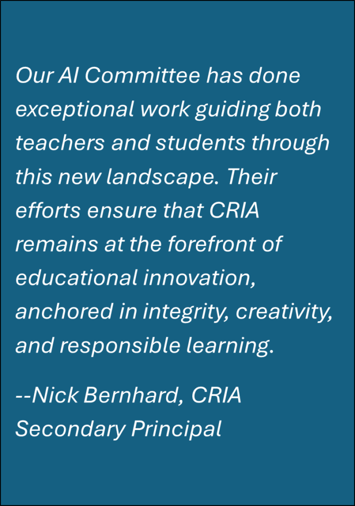 As AI continues to shape the world, CRIA is preparing students not only to adapt—but to lead. The next phase of our initiative will expand AI training to additional departments, introduce more classroom applications, and continue to model ethical and creative AI use.